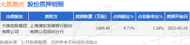 大族激光(002008)5月26日公开信息显示,股东大族控股集团有限公司向上海浦东发展银行股份有限公司深圳分行合计质押1409.4万股,占总股本1.34%。质押详情见下表: