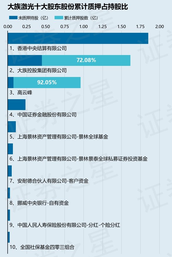 截止本公告日,股东大族控股集团有限公司已累计质押股份1.17亿股,占其持股总数的72.08%,股东高云峰已累计质押股份8866.0万股,占其持股总数的92.05%。本次质押后大族激光十大股东的累计质押股份占持股比例见下图: