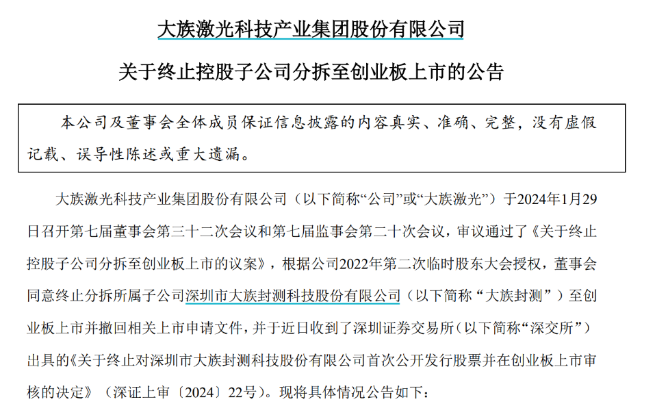 1月31日晚间,深交所披露,大族封测在1月29日申请撤回发行上市申请文件。深交所也决定终止对其首次公开发行股票并在创业板上市的审核。作为母公司,大族激光晚间也公告披露了这一事项。