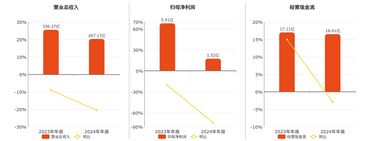 公司营业总收入为267.17亿元,较去年同报告期营业总收入减少69.20亿元,同比较去年同期下降20.57%。归母净利润为1.52亿元,较去年同报告期归母净利润减少4.39亿元,同比较去年同期下降74.34%。经营活动现金净流入为16.61亿元,较去年同报告期经营活动现金净流入减少4990.94万元,同比较去年同期下降2.92%。
