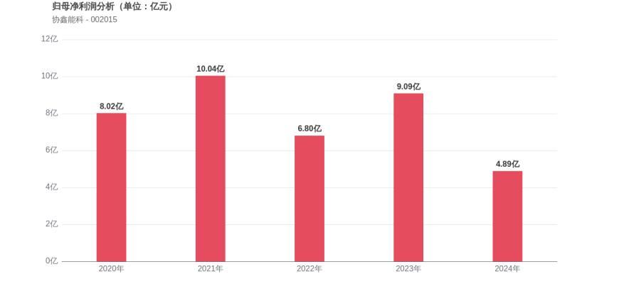 利润角度分析,2020年协鑫能科实现归母净利润8.02亿元,2024年4.89亿元。近五年归母净利润波动较大,整体呈现下降态势。