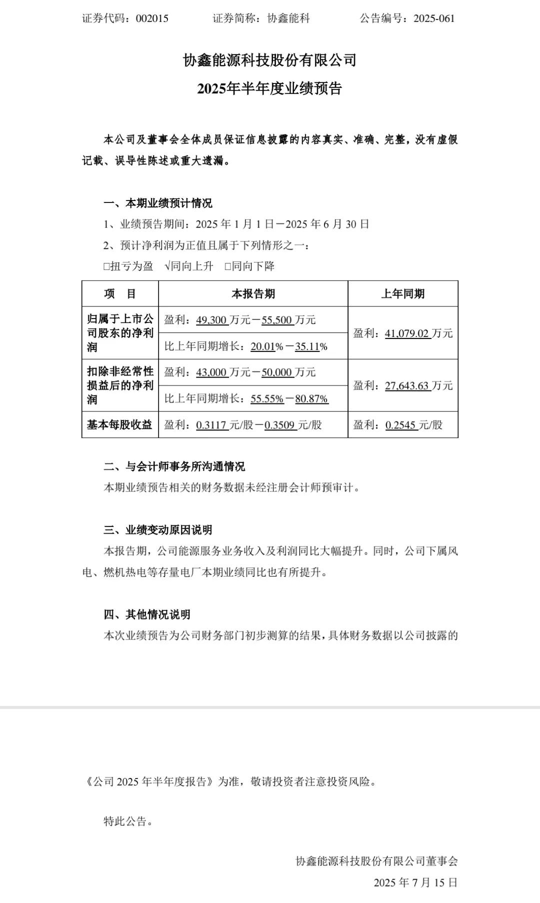 7月末晚间,协鑫能科(002015)发布2025年半年度业绩预告,预计上半年归属于上市公司股东的净利润为4.93亿元-5.55亿元,同比增长20.01%-35.11%。