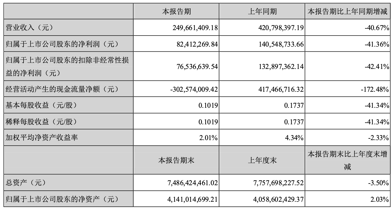 2021年第一季度,公司实现营业收入2.50亿元,同比减少40.67%;实现归属于上市公司所有者净利润0.82亿元,同比减少41.36%。