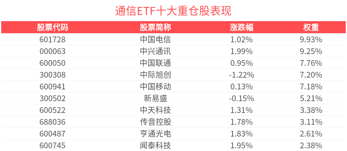 数据显示,截至2025年5月30日,国证通信指数前十大权重股分别为中国电信、中兴通讯、中国移动、中国联通、中际旭创、新易盛、中天科技、传音控股、闻泰科技、亨通光电,前十大权重股合计占比58.75%。