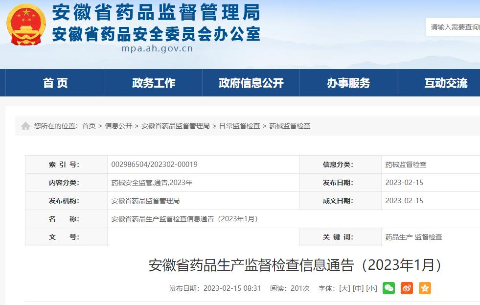 安徽省药品监督管理局(安徽省药品安全委员会办公室)网站日前公布《安徽省药品生产监督检查信息通告》(2023年1月)。