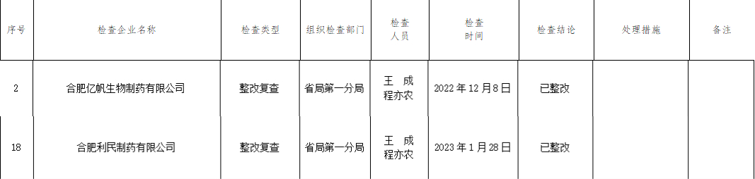 整改复查企业2家:合肥亿帆生物制药有限公司、合肥利民制药有限公司。合肥亿帆生物制药有限公司组织检查部门为安徽省局第一分局,检查人员王成、程亦农,检查时间2022年12月8日,检查结论为已整改;合肥利民制药有限公司织检查部门为安徽省局第一分局,检查人员王成、程亦农,检查时间2023年1月28日,检查结论为已整改。