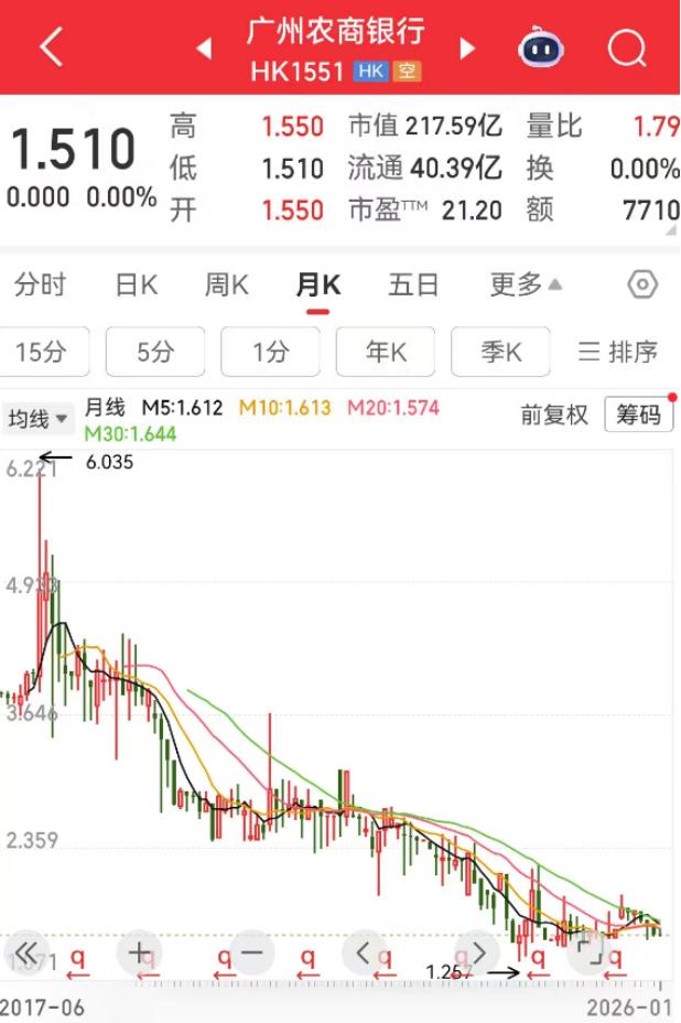 入股的上市公司股价不佳,广州农商行自身股价近年来同样低迷。2017年6月广州农商行登录港交所,截至1月14日收盘,总市值约217.6亿港元,股价1.51港元/股,较高点6港元/股下跌近75%。