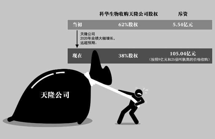 天隆公司就是科华生物此前收购,现因疫情而业绩爆发的标的公司。超预期的业绩,让收购时签下的后续协议成了阻碍双方继续合作的掣肘——根据协议,上市公司应按照105.04亿元的价格收购天隆公司剩余38%的股权,远超收购62%股权时的5.54亿元。面对巨大的价差,双方无法谈拢,只得诉诸仲裁。