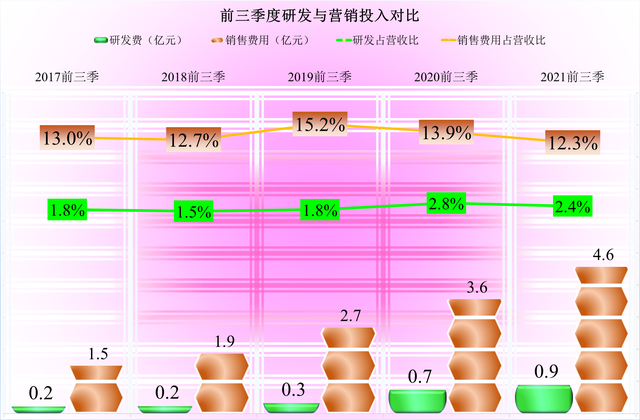 相反,所看到的是其销售费用占比数倍于研发支出,就算营收增长后,其占营收比下降的幅度都不太明显。