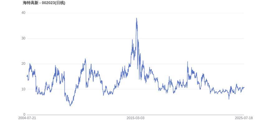 从上市首日至今,海特高新的市值实现了5.69倍的增长,显示出长期成长价值。2015年5月27日,海特高新的市值巅峰达到208.80亿元,股价也顺应升至30.98元。而至7月18日收盘,海特高新的股价为10.73元,市值为79.49亿元,相比峰值时期市值减少129.30亿元,市值蒸发了61.93%。
