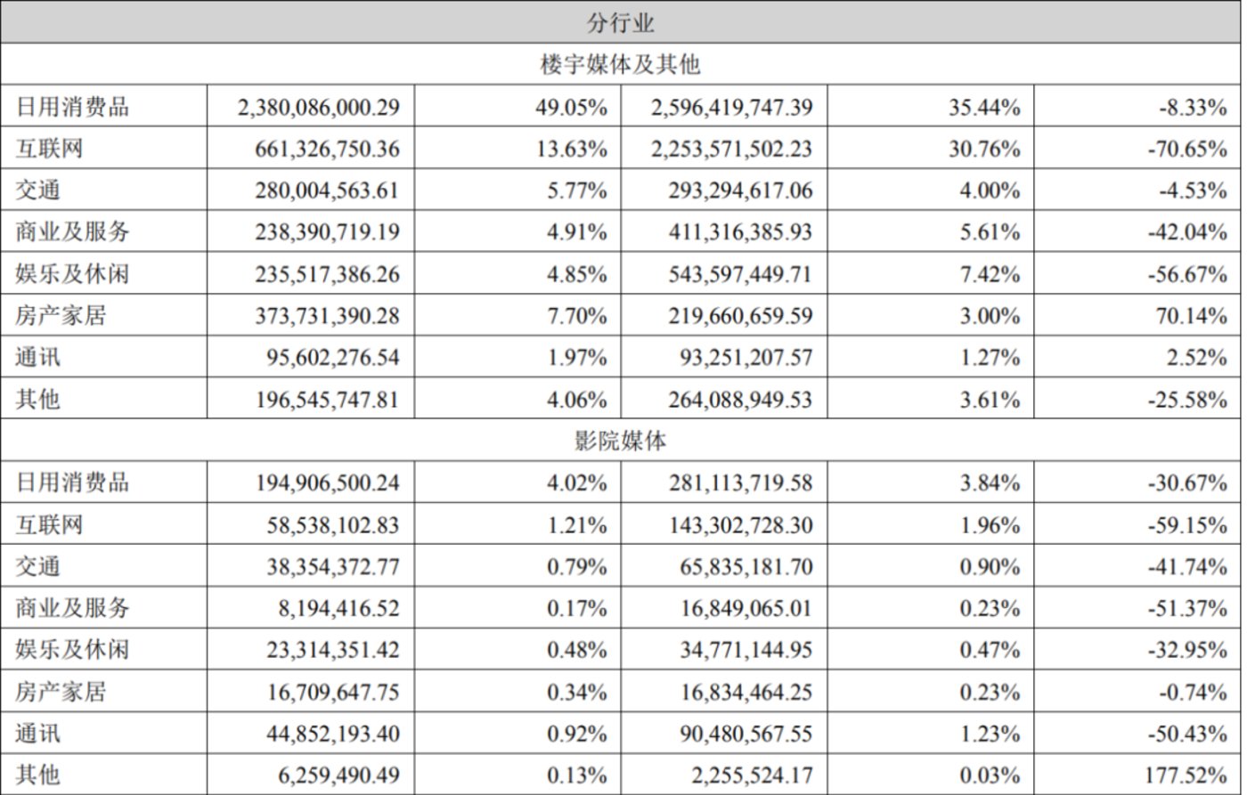 在营业收入构成明细表中,连线Insight注意到,不论是营收“大梁”楼宇媒体,还是影院媒体,来自“互联网”行业的广告收入下滑幅度均大于其他领域。