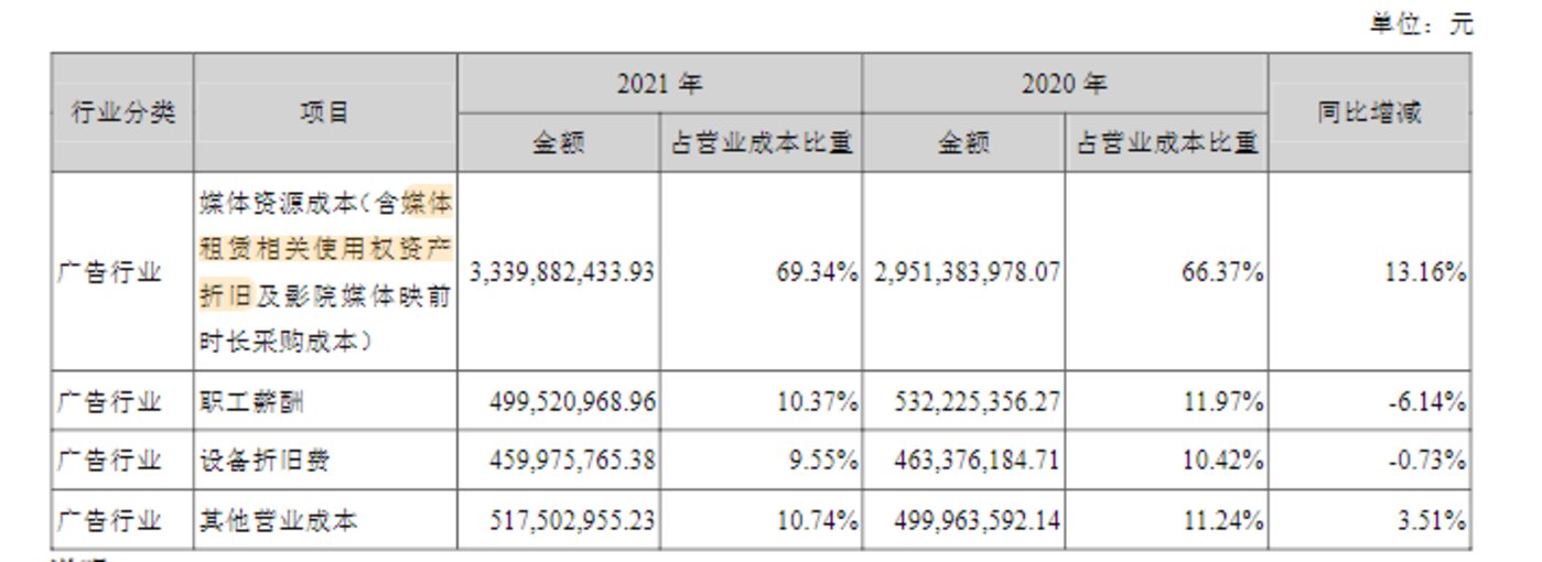 分众传媒“降本”动作主要表现在上述媒体数量收缩,原因或许从年报中能找到答案。2021年报显示,分众传媒的四项营业成本中,占比最大的就是媒体资源成本这一项目,接近70%。