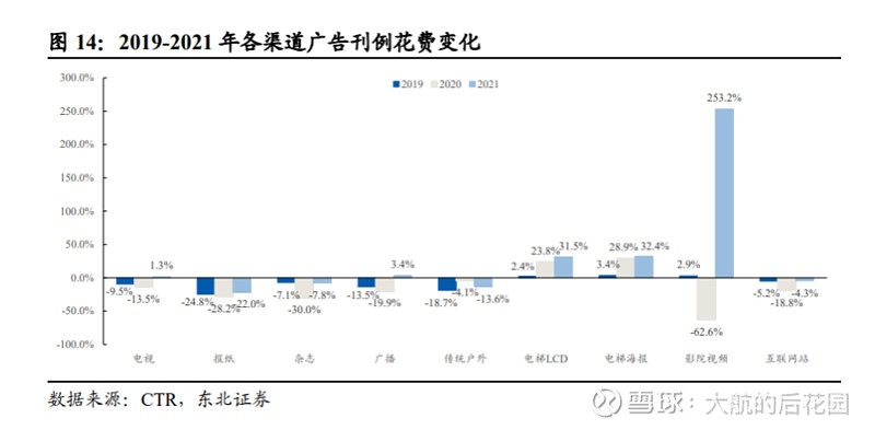 根据CTR数据,在2019-2021年间,传统广告媒体以及互联网渠道都面临广告刊例花费下滑的问题;而电梯LCD以及电梯海报渠道却出现了刊例花费的逆势上涨。
