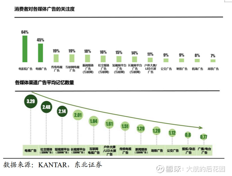 从实际调研数据来看,有机构做过相关的调查,消费者对电影院广告和电梯广告的关注度最高;消费者对电梯广告的平均记忆数量最高。此外,在到达率、接触时长等方面,电梯广告也有不错的表现。