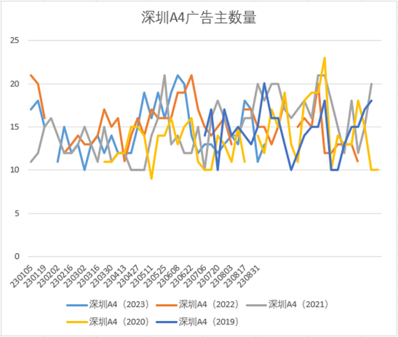 分众传媒广告主数量方面,我们目前只记录了深圳A4点位数据;同比看,8月广告主数量同比跌幅开始收窄;环比看,8月广告主数量在历经2个月的连续环比明显下滑后开始企稳回升;整体来看,自5月后分众广告主数量的淡旺季特征更明显。8月深圳A4点位广告主数量为14.6个,同比-6.81%,环比+14.51%;7月为12.75个,同比-15%,,环比-25.87%。