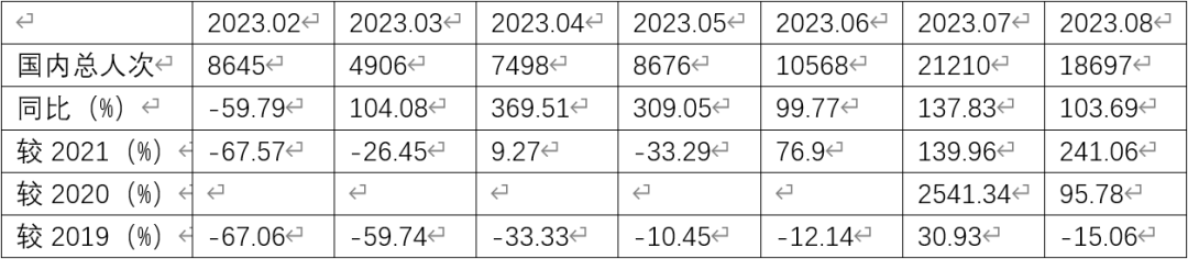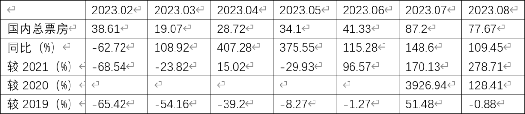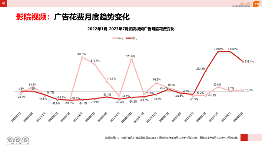 影院媒体方面,根据CTR,2023年7月国内影院媒体刊例花费同比继续暴增,最主要的还是基数原因(2022年7月仍受疫情防控影响),环比增长提速;展望8月,由于暑期档强劲,因票房和观影人次同比大幅增长,预计影院媒体也将继续同比大幅增长,随着影院广告的恢复,也许8月影院媒体环比表现可能好于票房和观影人次。根据CTR,2023年7月国内影院媒体刊例花费同比增+338.4%。根据猫眼数据,2023年8月国内总票房为77.67亿元,同比+109.45%,较2021年同期+278.71%,环比7月-10.93%;8月国内观影人次为18697万人次,同比+103.69%,较2021年同期+241.06%,环比7月-11.85%。