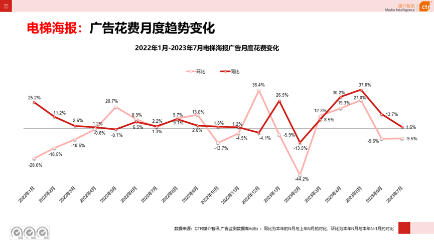 电梯媒体方面,根据CTR,同比看,7月电梯LCD和电梯海报刊例花费同比增速分化明显(电梯LCD同比增速提升且维持超20%的增长,但电梯海报同比增速延续回落,同比基本持平了),我们推测可能和不同广告主广告预算有关(电梯LCD偏向于头部客户,电梯海报偏向于中小客户,在经济恢复期间,头部广告主的广告预算可能边际变化更明显,拐点更早);环比看,7月电梯LCD和电梯海报刊例花费换比也分化明显(电梯LCD较5月旺季下滑不多,7月环比企稳,电梯海报则延续较明显的环比下滑),推测原因和前述一样。根据CTR数据,2023年7月国内电梯LCD刊例花费同比+25.8%,环比+0.2%;电梯海报刊例花费同比+1.6%,环比-9.5%。