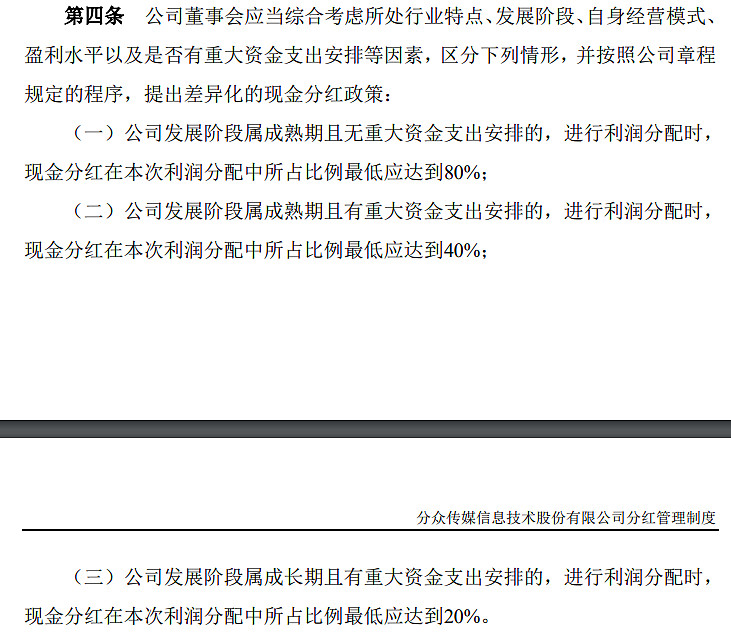 在分众于2021年4月发布的《分众传媒:公司股东分红回报规划(2021年度-2023年度)》及2023年4月发布的《分众传媒:分众传媒分红管理制度》中,对于分红政策均有以下明确规定: