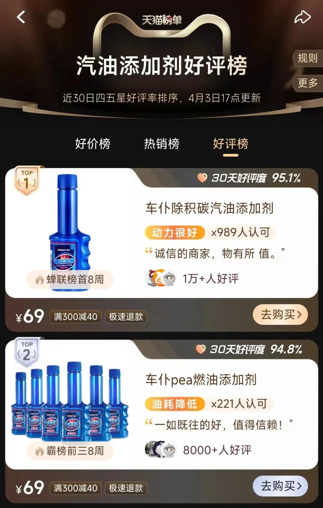 凭借超越同类产品的功效和品质,车仆燃油宝在抖音、快手、天猫、京东、拼多多等各大平台位居销量榜首,赢得广大车主的青睐与好评!