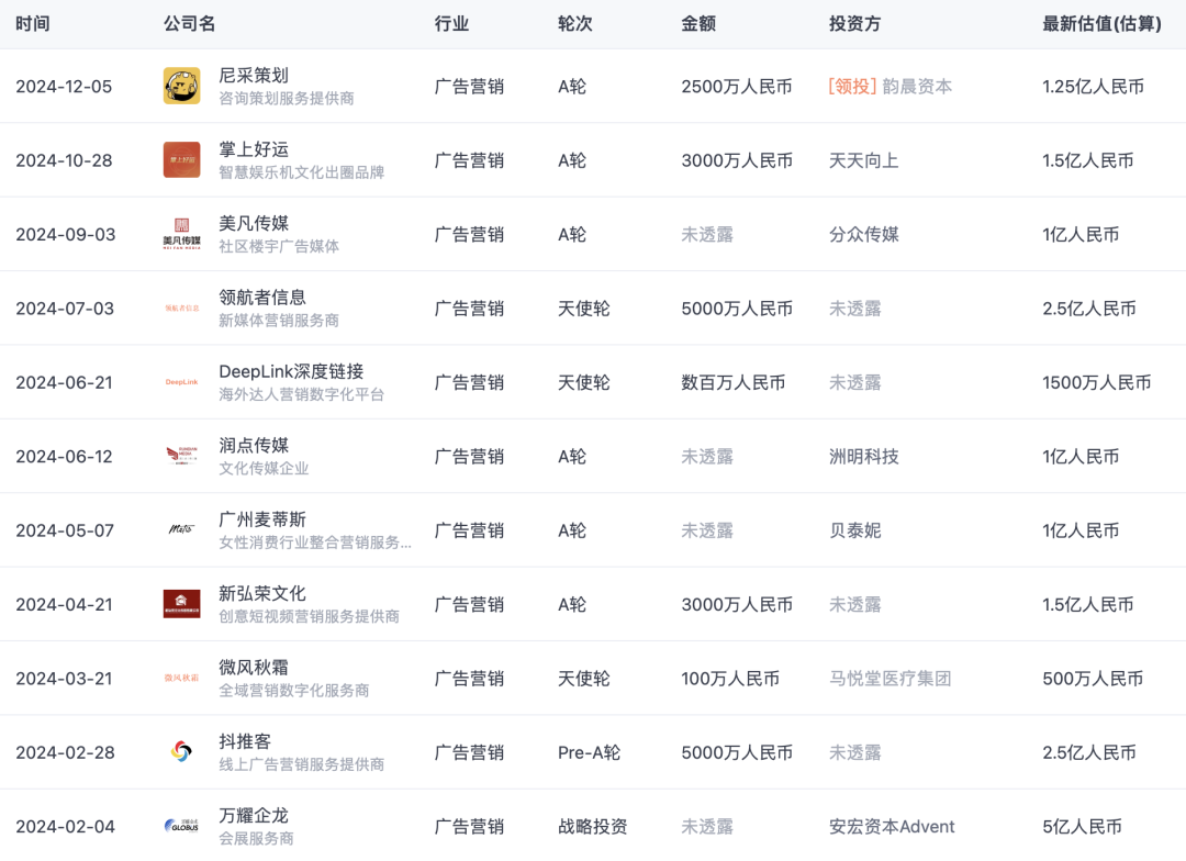 这一方面是因为广告行业通常成本可控、利润可观,对于投融资的需求不高,另一方面则是行业比较分散,各个垂直门类的广告营销各不相同,因此较难形成规模化的“大生意”,对资本的吸引力不足。