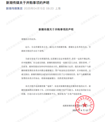 近日,分众传媒发布公告,拟以83亿元合并新潮传媒。4月15日早间,新潮传媒发布关于并购事项的声明。