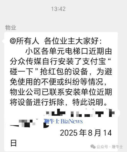 鞭牛士获悉,昨日下午,一小区物业在住户群发布一则通知,称小区各单元电梯口近期由分众传媒自行安装了支付宝“碰一下”抢红包的设备。