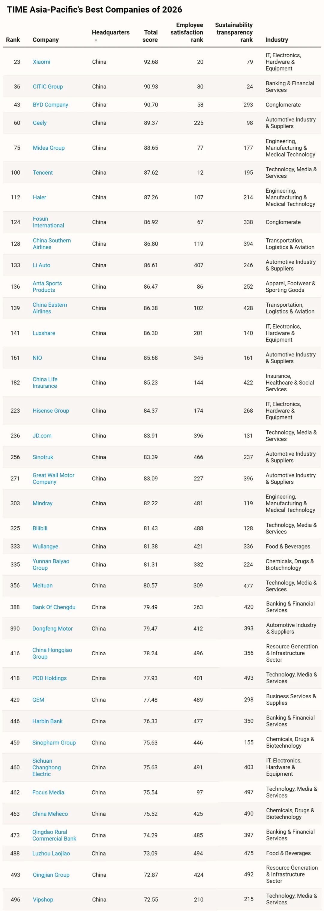 中国大陆地区入选企业名单: