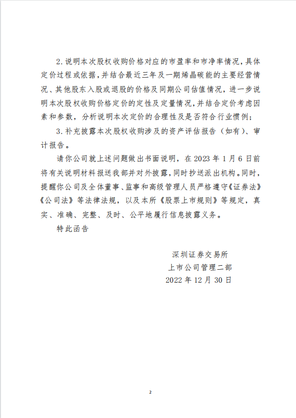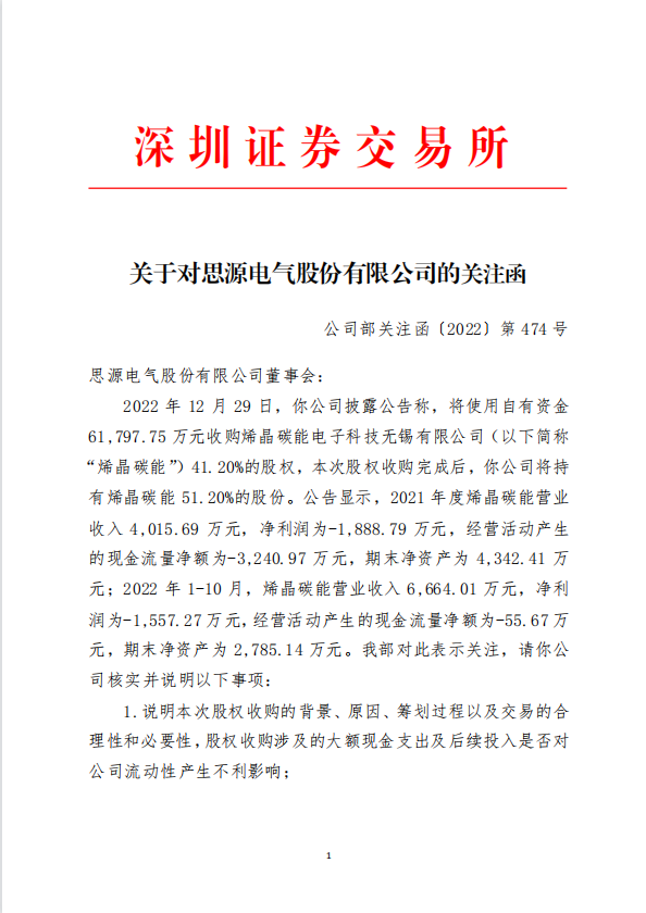 2022年12月30日,思源电气收到深交所下发关注函。关注函显示,12月29日,思源电气公告,将使用自有资金约6.18亿元收购烯晶碳能电子科技无锡有限公司(以下简称“烯晶碳能”)41.20%的股权,本次股权收购完成后,公司将持有烯晶碳能51.20%的股份。