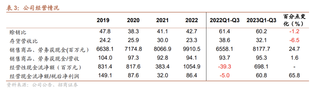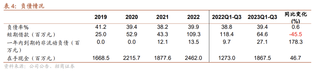 2023年Q1-Q3的费用率合计14.17%,同比上升2.92个百分点,其中销售、管理、研发、财务费用率分别为4.39%、2.63%、7.31%、-0.15%,同比分别变化0.23、-0.05、1.83、0.91个百分点,其中研发费用增长较快,主要是公司持续加大研发投入和新产品开发力度。2023年Q1-Q3公司经营性现金流净额为6.98亿,现金流强劲。