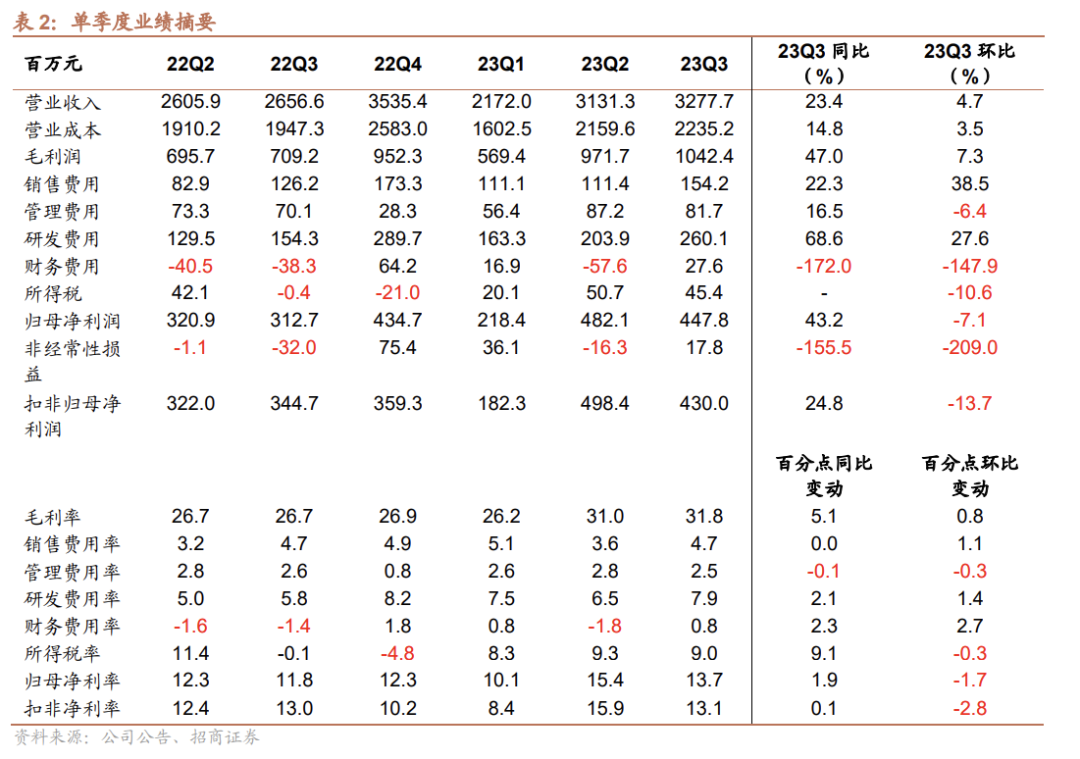 ?公司公告:2023年Q1-Q3公司营收、归母利润、扣非净利分别为85.81、11.48、11.11 亿元,分别同比增长22.55%、46.14%、37.31%。其中Q3营收、归母净利、扣非净利分别为32.78、4.48、4.3亿元,同比分别增长23.38%、43.2%、24.75%。