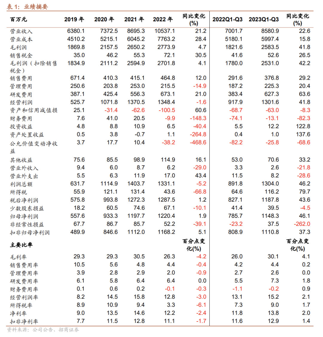 Q3业绩超预期。2023年Q1-Q3公司营收、归母利润、扣非净利分别为85.81、11.48、11.11 亿元,分别同比增长22.55%、46.14%、37.31%。其中Q3营收、归母净利、扣非净利分别为32.78、4.48、4.3亿元,同比分别增长23.38%、43.2%、24.75%,Q3业绩强劲增长。