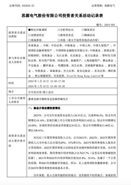 思源电气向投资者介绍了2023年业绩快报情况。2023年,公司全年实现营业总收入124.51亿元,完成率98.5%,较去年同期增长18.16%。实现归属上市公司股东的净利润15.45亿元,较去年同期增长26.60%。实现经营活动现金净流量22.01亿元,较去年同期增加11.46亿元,增长108.61%。