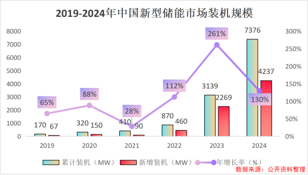 2023年我国新型储能市场新增装机2269MW,累计装机达到3139MW,新型储能市场累计装机规模的年增长率高达261%,此后也一直保持着较高的增长速度。