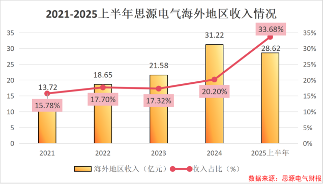 2021到2025年上半年,思源电气海外地区收入占比不断提升。2025年上半年,公司海外地区收入达到28.62亿元,同比增加89%,收入占比达到33.68%,创下历史新高。