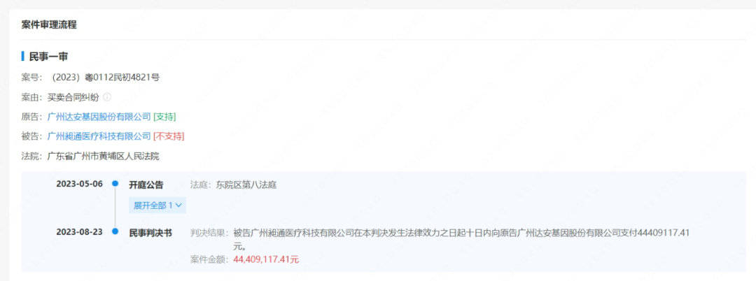 结果:被告广州昶通医疗科技有限公司在本判决发生法律效力之日起十日内向原告广州达安基因股份有限公司支付44409117.41元。