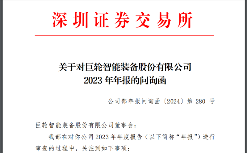 深交所问询函称,年报及前期公告显示,2023 年以来,巨轮智能公司非独立董事变更3 人次、监事变更 1 人次、财务总监变更 2 人次。