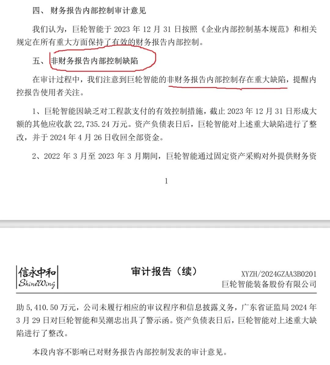 4月30日,信永中和会计师事务所在巨轮智能2023年的内审报告中称,巨轮智能的非财务报告内部控制存在重大缺陷,提醒内控报告使用者关注。