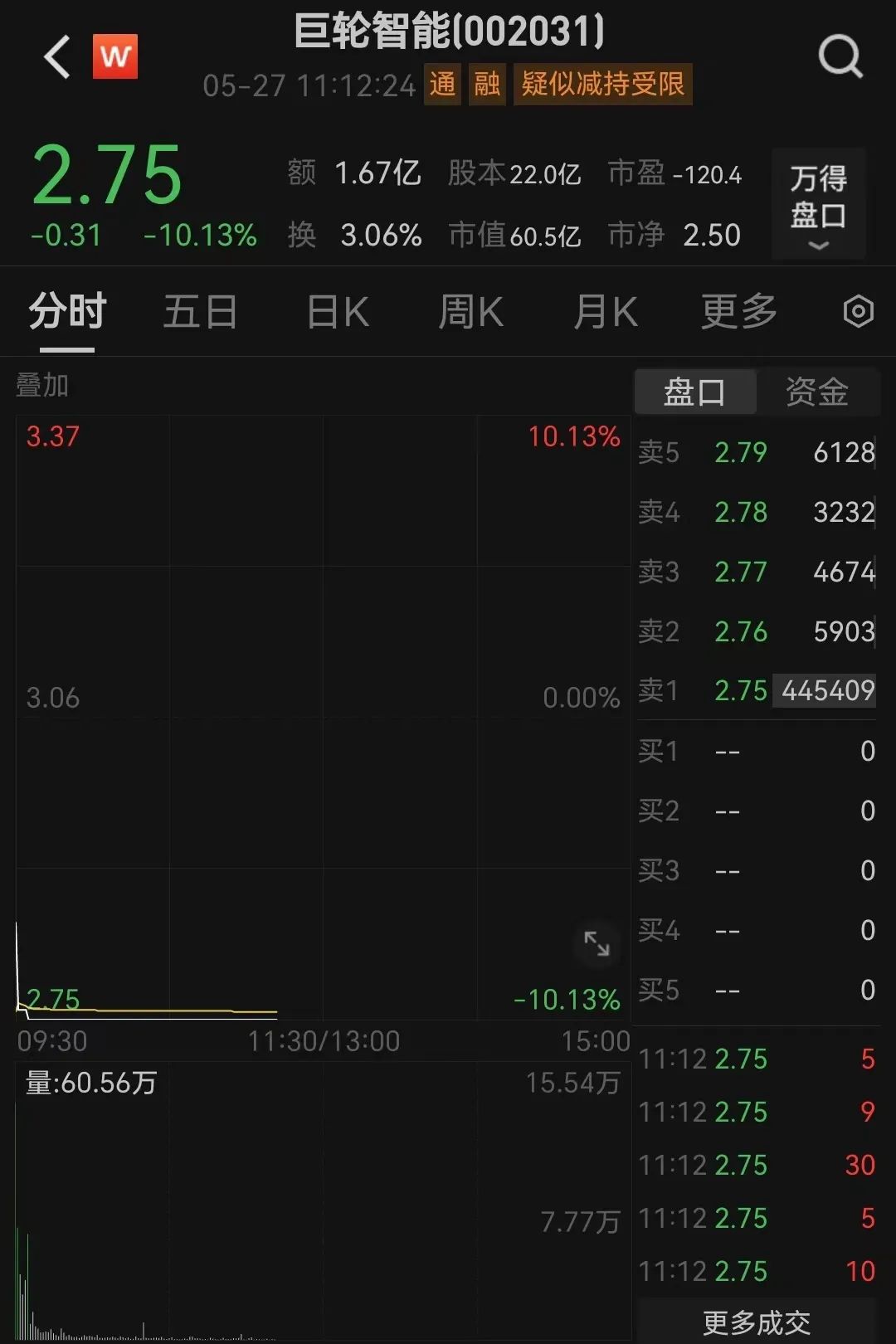 5月27日早盘,巨轮智能以跌停开盘。截至记者发稿,巨轮智能股价为2.75元,依旧封死在跌停板;市值60亿。