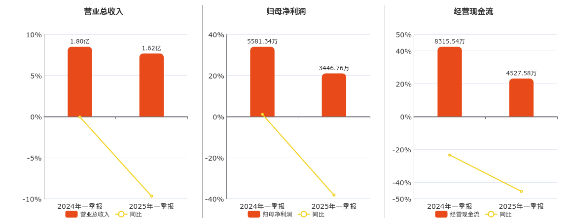 公司营业总收入为1.62亿元,较去年同报告期营业总收入减少1744.38万元,同比较去年同期下降9.69%。归母净利润为3446.76万元,较去年同报告期归母净利润减少2134.58万元,同比较去年同期下降38.24%。经营活动现金净流入为4527.58万元,较去年同报告期经营活动现金净流入减少3787.96万元,同比较去年同期下降45.55%。