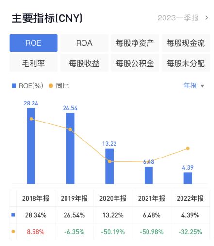 另据乐居财经查阅, 2018年-2022年公司ROE分别为28.34%、26.45%、13.22%、6.48%、4.39%。