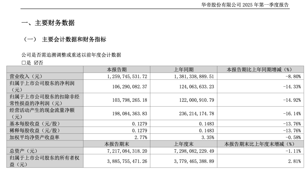 近日,华帝股份(002035.SZ)发布2025年一季度财报显示,一季度,公司实现营收12.60亿元,同比减少8.80%;归属于上市公司股东的净利润1.06亿元,同比减少14.33%;归属于上市公司股东的扣除非经常性损益的净利润1.04亿元,同比减少14.92%。