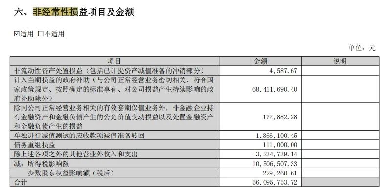 然而,值得注意的是,在这份亮眼的成绩单背后,非经常性损益项目成为了联创电子净利润扭亏的关键推手。财报显示,今年上半年,联创电子计入当期损益的政府补助为6841.17万元,占当前非经常性损益项目的121.96%。