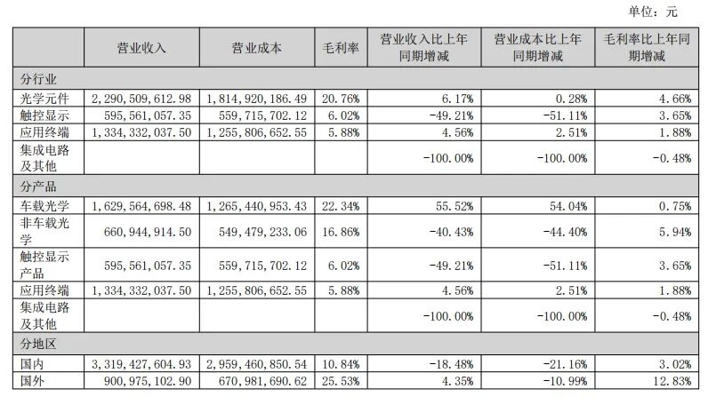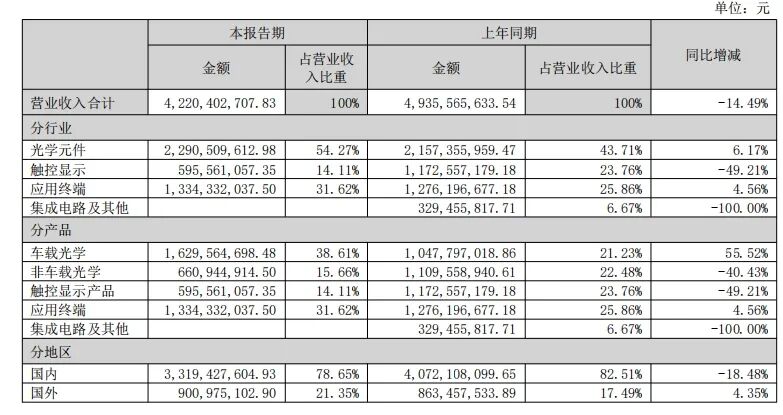 非车载光学产品和触控显示产品今年上半年的营收分别是6.61亿元和5.95亿元,分别同比下滑了40.43%和49.21%。