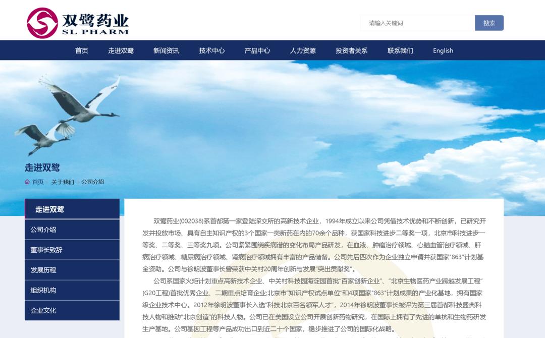 双鹭药业(002038)系首都第一家登陆深交所的高新技术企业,1994年成立以来公司凭借技术优势和不断创新,已研究开发并投放市场、具有自主知识产权的3个国家一类新药在内的70余个品种。