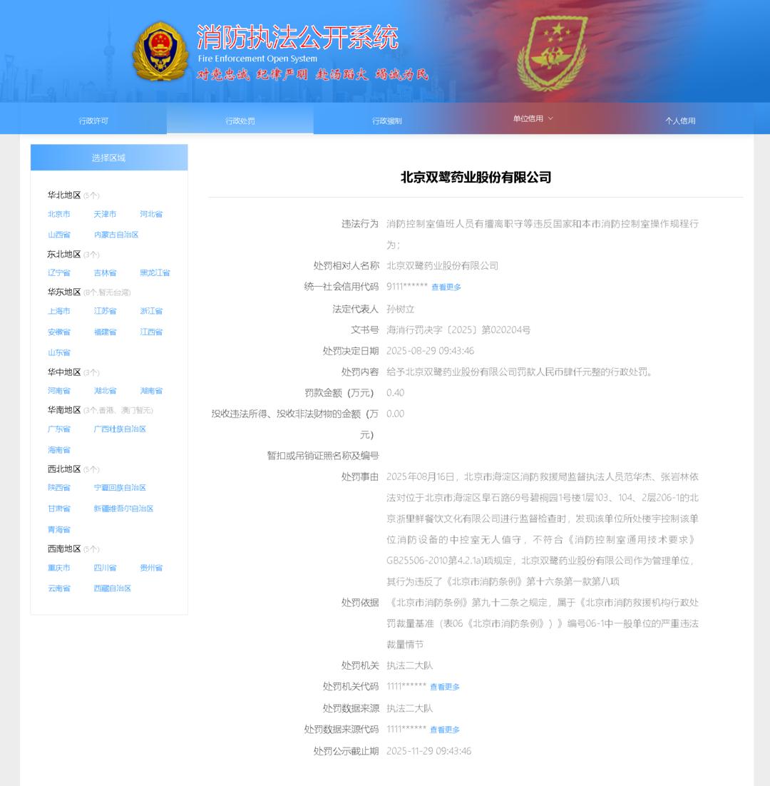 近日,记者从消防执法公开系统官网获悉,北京双鹭药业股份有限公司因管理单位出现消防安全问题被罚0.4万元。