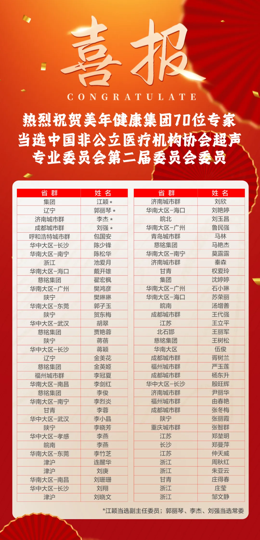 同时,美年健康集团济南城市群李杰、成都城市群刘强、辽宁省区郭丽琴3位专家凭借精湛的专业技术、丰富的临床经验和卓越的学术影响力,成功当选为常委。此外,还有66名美年健康超声专家当选为正式委员,这一庞大的专业团队凝聚了美年健康在超声领域的精英力量,为推动行业交流与合作、促进超声技术的发展奠定了坚实的基础。