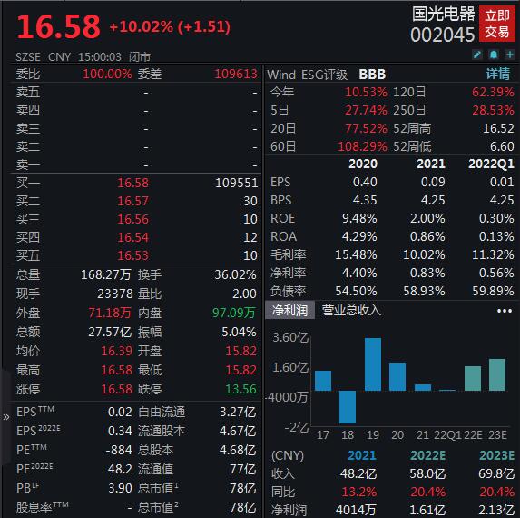 业绩方面,国光电器2022年一季度实现营收1.12亿元,同比增加1.3%;归属于上市公司股东的净利润600.5万元,同比减少89.07%。