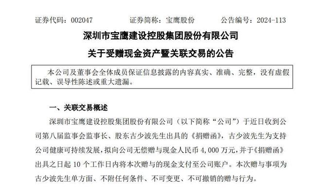 宝鹰股份发布的《关于受赠现金资产暨关联交易的公告》显示,公司近日收到公司第八届监事会监事长、股东古少波先生出具的《捐赠函》,古少波先生为支持公司健康可持续发展,拟向公司无偿赠与现金人民币4000万元,并于《捐赠函》出具之日起10个工作日内将本次赠与的现金支付至公司账户。本次赠与事项为古少波先生单方面、不附任何条件、不可变更、不可撤销的赠与行为。