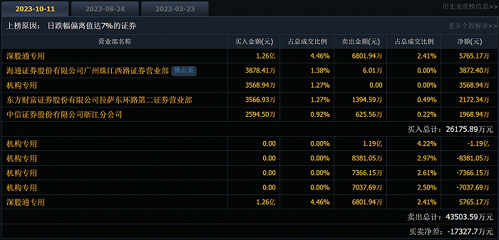 10月11日盘后数据显示,紫光国微因当日跌幅偏离值达7%的证券而登上龙虎榜,多主力现身。