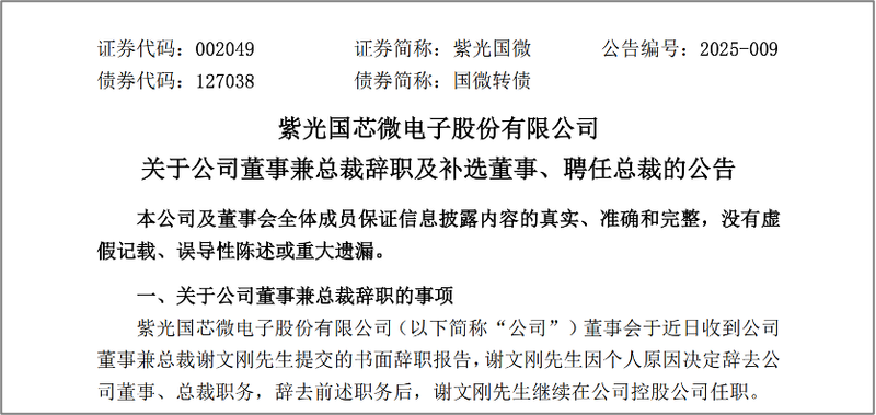 半导体行业龙头紫光国微2月17日晚间披露人事变动,公司总裁谢文刚辞任,由李天池接棒出任紫光国微总裁一职。